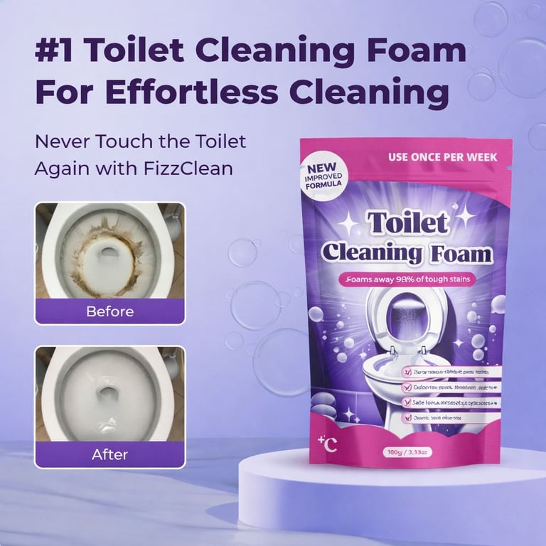 Transform the way you clean with FizzClean. Its powerful toilet cleaning foam effortlessly tackles tough stains, bacteria, and odors – all without the need for scrubbing.
